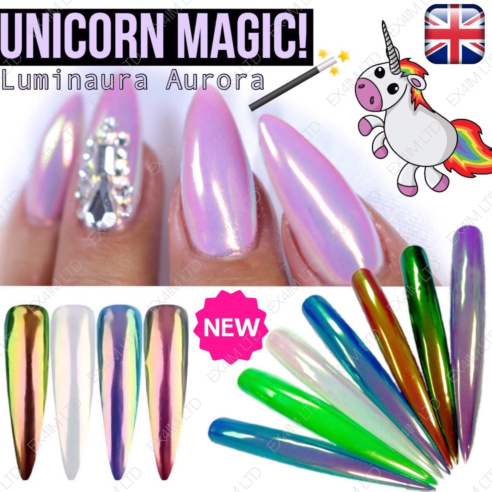 Gold: Take your unicorn horn to a whole other level with gold paint. Done in vivid pastels Metallic powder is also used to give the nails extra shine and dimension. Aurora Laser Unicorn Nail Powder - BeautyBigBang.com Review.